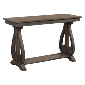 Bold curves provide elegant contrast to the unique look of the Toulon Collection. The heavily scrolled base supports of the sofa table feature French provincial inspired routing while distressed dark oak finish provides texture to the acacia veneer.