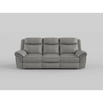 With amply appointed offerings that create not only a comfortable seating experience but a functional one as well, the Aram Collection will be a welcome addition to your home. The seating group is offered in a brown polished microfiber for comfort and style that will blend effortlessly with your transitional decorative preference. Manual motion mechanisms operate with the pull of a side-mounted tab, that once engaged, take you from seated to reclined in an easy motion. The sofa features dual reclining ends and a drop down center seat back with cup-holders, electric receptacles, USB port and tabletop space.