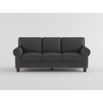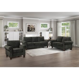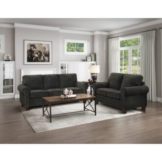 Casual traditional styling creates the look of the Cornelia Collection. Dark gray microfiber covering for neutral complement to your home’s décor. Nail head trim along with rolled arms lend to the soft traditional style.