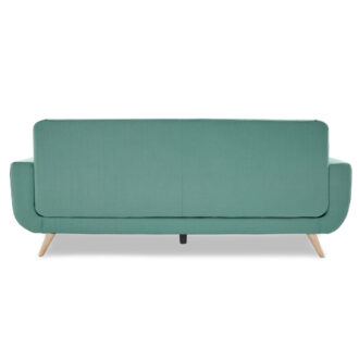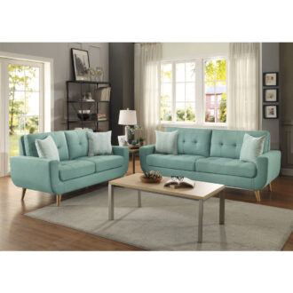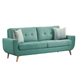 Mid-Century modern design is the inspiration for the Deryn Collection. Wide, dramatically curved arms rise to the straight back that is synonymous with this classic style. Contrast toss pillows and an additional chair option are featured in a modern teal herringbone pattern to complement the teal fabric seating body covers. Tailored stitch tufting lends further accent to this thoroughly sofa.