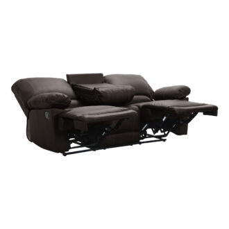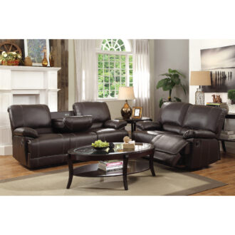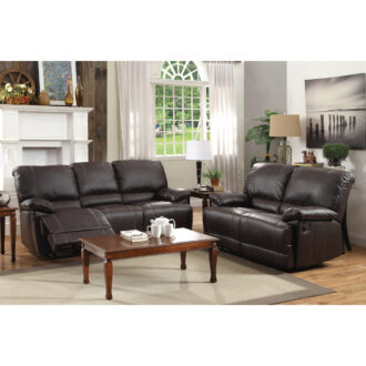 Uniquely appointed for ultimate relaxation, the Cassville Collection will provide your living room with a comfortable place to spend your downtime. Dark brown faux leather covers the plush seating of this sofa, which features a unique drop down back center console and dual reclining ends.