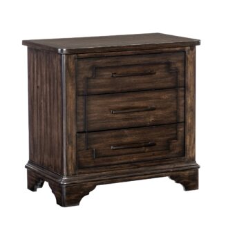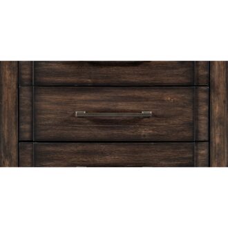 The rustic brown finish over acacia veneer solidifies the rusticated design of the Boone Collection, its rugged aesthetic and traditional lines creating a versatile addition to your transitionally styled bedroom. Dark bronze-finished bar hardware fronts the drawers of the nightstand, their wide profile and earthy hue providing complementing accent to the framed case piece.