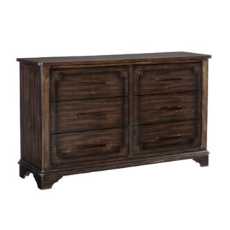 The rustic brown finish over acacia veneer solidifies the rusticated design of the Boone Collection, its rugged aesthetic and traditional lines creating a versatile addition to your transitionally styled bedroom. Dark bronze-finished bar hardware fronts the drawers of the dresser, their wide profile and earthy hue providing complementing accent to the framed case piece.
