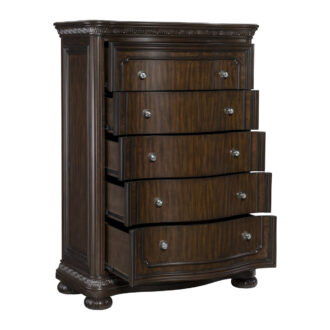 The traditional profile of the Beddington Collection pairs classic accent with elegant highlight to create a timeless look for your bedroom. Stylized decorative molding defines the bow-fronted shape of the traditional chest, as do the bun feet and picture frame molding that fronts the drawers. Primavera and ash burl veneer are finished in dark cherry for elegant enhancement of the wood’s grain. Each drawer front is centered by metal and faux crystal knob hardware, an unexpected combination that cements the grandeur of this collection.