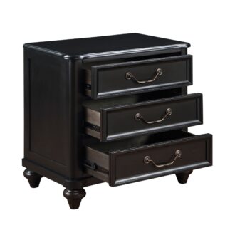The traditional profile of the Herman Collection is achieved with a perfect blend of classic elements that create a look that complements the style of your bedroom. Turned feet provide support to the classic design of the nightstand. The piece features charcoal brown finish, over birch veneers, highlighting the beautiful wood grain. An antiqued finish lends elegant patina to the traditional hardware of the nightstand’s drawer fronts.