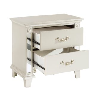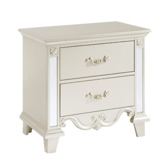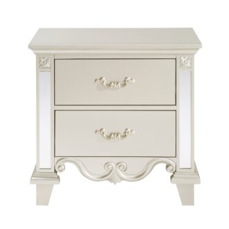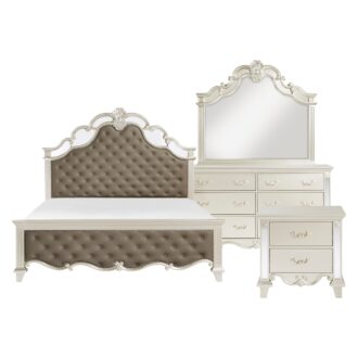 Traditional accenting is elegantly paired with glamorous flair to create the look of the Ever Collection. A champagne finish covers the bedroom group with mirror accent framing providing a reflection of your inspired design. Scrollwork and routing provide classic detail while the gold hue of the bed’s button-tufted upholstered panels complements the gold finish that covers the bedroom group.
