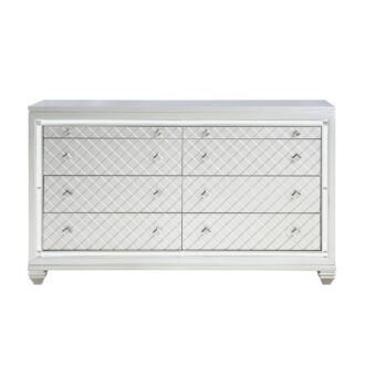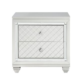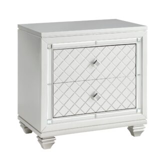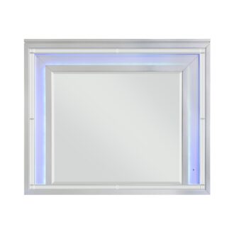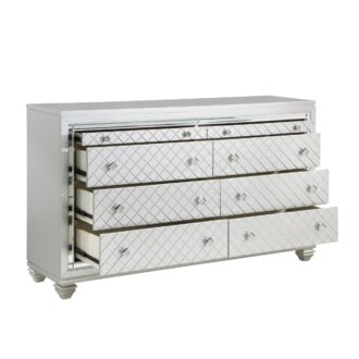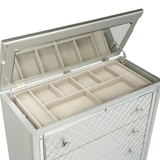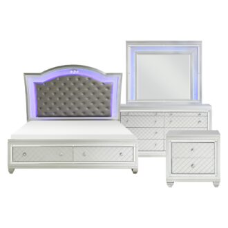 The bold visual presentation of the Leesa Collection complements your glamorous design aspirations. Diamond pattern drawer fronts and hardware are featured on the dresser, nightstand, chest, and storage footboard. The top of the chest opens to reveal a hidden jewelry compartment, its ease of use enhanced with a mirror mounted on the underside of the chest’s top. LED backlighting on the headboard and mirror frame illuminate with a touch of a button. The headboard’s silver faux leather upholstered headboard panel is button tufted lending classic accent to the look of the collection.
