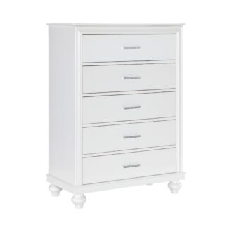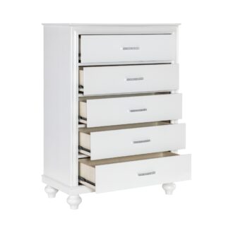 Visually mesmerizing, light dances off the accentuating details of the elegant Aria Collection. The eye-catching iridescence of the embedded acrylic crystal hardware that fronts each drawer sparkles against the bright white finish of the collection.