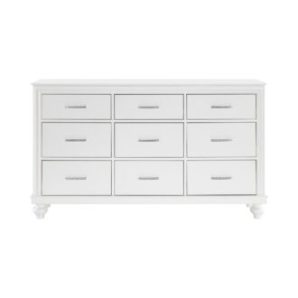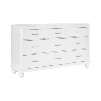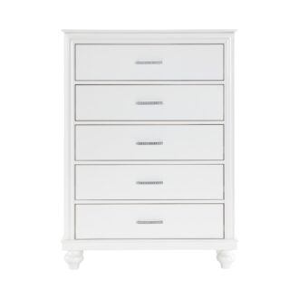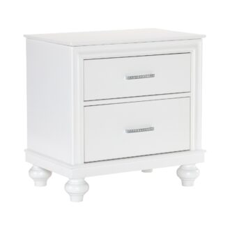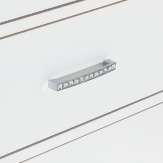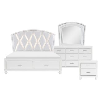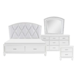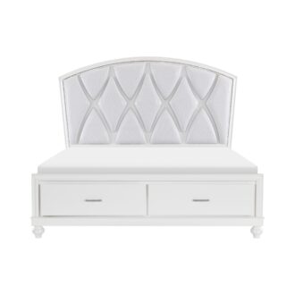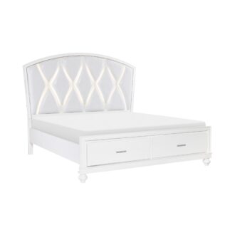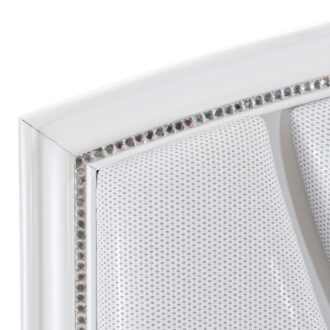 Visually mesmerizing, light dances off the accentuating details of the elegant Aria Collection. The eye-catching iridescence of the headboard’s upholstered fabric panels is illuminated with back-lit LED while the embedded acrylic crystal hardware that fronts each drawer sparkles against the bright white finish of the collection. Additional storage within your bedroom comes in the form of the footboard’s drawers, their placement a convenient location for clothing or linens.