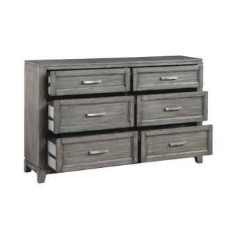 The Garretson Collection blends transitional lines with rustic styling to create an elegant addition for your bedroom. The distinct grain of the okume veneer features a gray finish. Metal bar hardware accents the picture frame drawer fronts of the dresser.