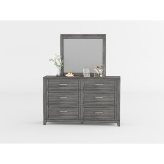 The Garretson Collection blends transitional lines with rustic styling to create an elegant addition for your bedroom. The distinct grain of the mirror frame’s okume veneer features a gray finish while the picture frame molding lends classic accent to your space.
