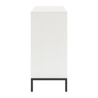 Thoroughly modern with a nod to Mid-Century design, from its clean lines to bold accents, the Oslo Collection perfectly defines your preference for inspired design. V-match pattern acacia veneer fronts the drawers of the dresser, with a walnut finish that highlights the grain, providing distinct contrast to the bright white finish of the piece. The intersection of the drawer front’s routed detail is centered by square black inset hardware, the combination a stunning detail. Black-finished metal legs provide support to the dresser.