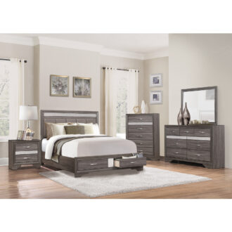 The unique styling of the Luster Collection presents a glamorous option for your bedroom. The dresser’s embossed faux-wood veneer features a gray finish that allows for the acrylic silver glitter fronts of the hidden jewelry drawers to shine. The jewelry drawers feature felt lining to protect your hidden items from wear and tear. Polished chrome bar drawer pulls front the drawers providing complementing contrast to the collection’s finish.