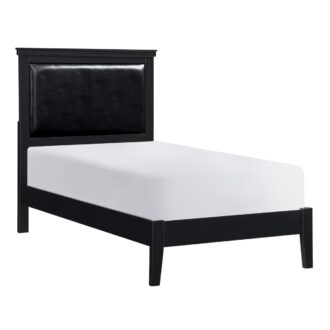 Merging traditional and transitional design creates the look of the Seabright collection, providing a unique platform from which to style your bedroom. The black painted finish allows for exceptional versatility of placement and decorative inspiration. The twin bed features framed, color-coordinated, faux leather padded headboard insert and an ultra-low-profile footboard.