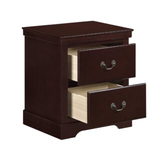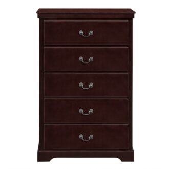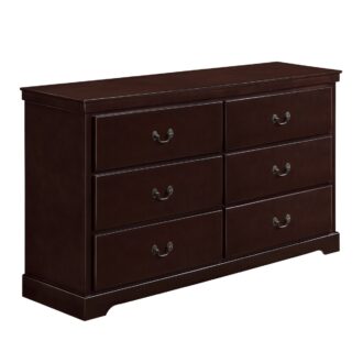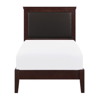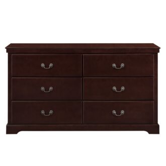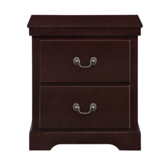 Merging traditional and transitional design creates the look of the Seabright Collection, providing a unique platform from which to style your bedroom. The cherry painted finish allows for exceptional versatility of placement and decorative inspiration. The bed features framed, color-coordinated, dual faux leather padded headboard inserts and an ultra-low-profile footboard. The traditional styling of the satin nickel bale and pull hardware lends to the classic profile.