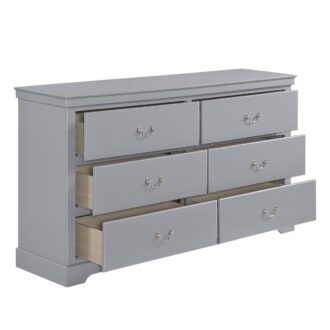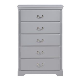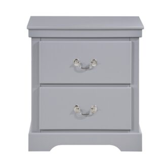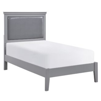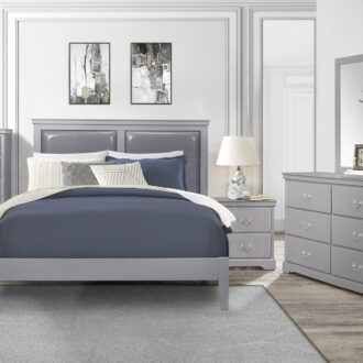 Merging traditional and transitional design creates the look of the Seabright Collection, providing a unique platform from which to style your bedroom. The gray painted finish allows for exceptional versatility of placement and decorative inspiration. The bed features framed, color-coordinated, dual faux leather padded headboard inserts and an ultra-low-profile footboard. The traditional styling of the satin nickel bale and pull hardware lends to the classic profile.