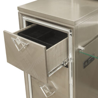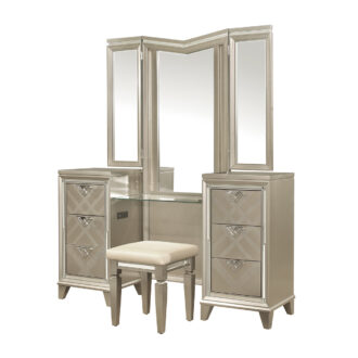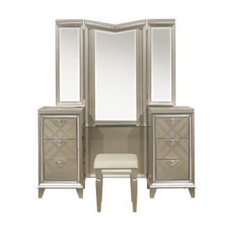 Dramatic from every angle, the Bijou Collection presents as a glamorous statement to the décor of your boudoir. The mirrored framing of the vanity provides subtle reflection and distinct accent. The drawers of the vanity are fronted with triangle-shaped polished chrome hardware as well as a distinct geometric pattern. The vanity features a hidden jewelry box drawer allowing for the discrete storage of your personal accessories. The vanity also has jewelry hooks mounted on the back of the mirror as well as drawers and a center glass top.