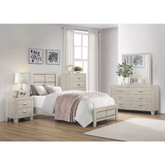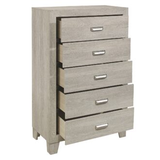 The modern styling of the Quinby Collection is achieved by blending the natural look of wood grain and the clean lines of contemporary design to create a unique bedroom group that will fit right in with your home’s aesthetic. The embossed faux-wood grain of the chest is perfectly complemented by the subtle contrast of the nickel-finished metal fixed drawer pulls and the clean, defining lines of the framing.