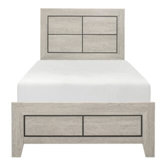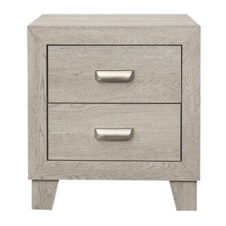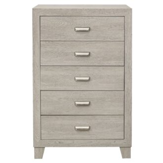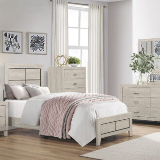 The modern styling of the Quinby Collection is achieved by blending the natural look of wood grain and the clean lines of contemporary design to create a unique bedroom group that will fit right in with your home’s aesthetic. The embossed faux wood grain of the collection is perfectly complemented by the subtle contrast of the nickel finished metal fixed drawer pulls and the defining lines of the headboard and footboard’s routed framing.