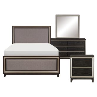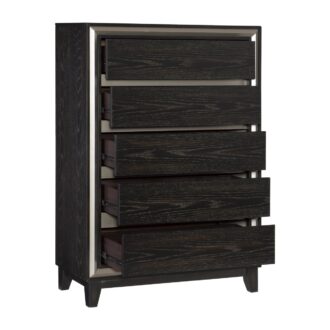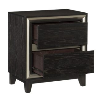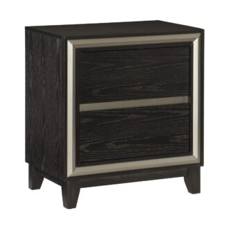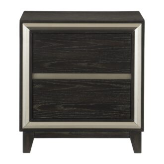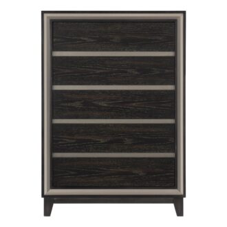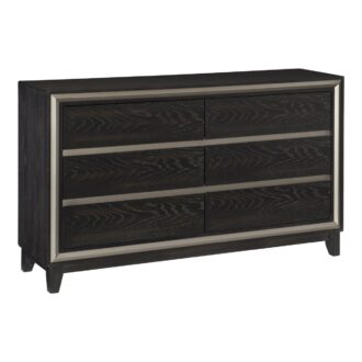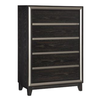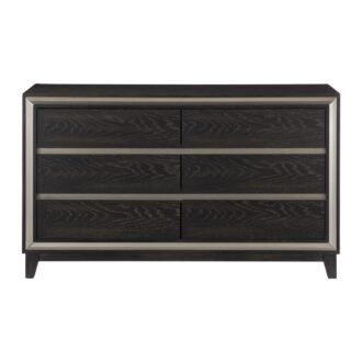 The Grant Collection features a streamlined profile and visual complementing contrast, with the resulting design being a perfect fit for your modern home. An ebony finish is utilized over oak veneer, highlighting the distinct grain, with silver finished banding defining the fronts of each piece in the collection. Hidden, under-drawer finger pulls further the minimalistic look of the collection.