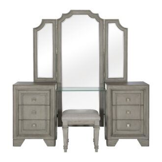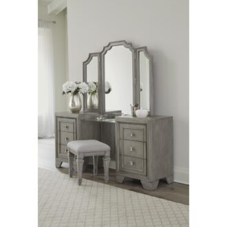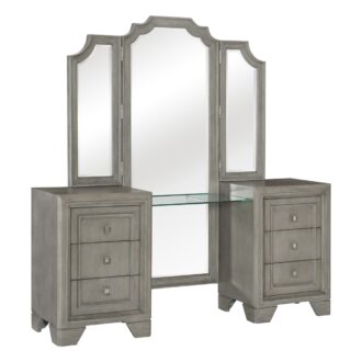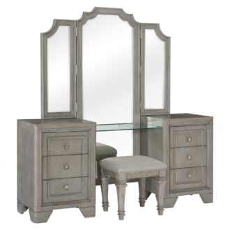 In the Colchester Collection, a modern take on traditional design creates an elegant profile for your bedroom’s décor. The driftwood gray finish of the vanity is complemented by its distinct features including the tri-fold mirror, silver finished hardware, glass top, drawer units and jewelry hooks on the back of the side mirrors. Framed drawer fronts and picture frame molding further the classic look of the collection.