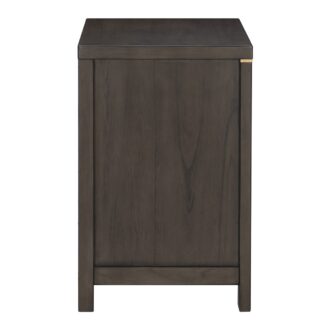 The elegant modern profile of the Scarlett Collection will be the perfect addition to your bedroom. Cashew solid wood and mindy veneer is finished in a brownish gray with gold finished hardware and accent banding lending subtle contrast to the profile of the nightstand.
