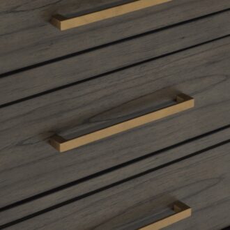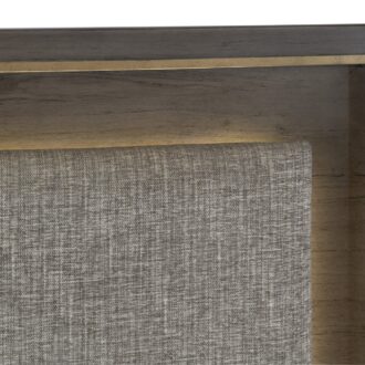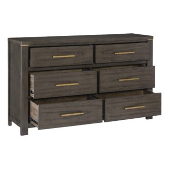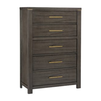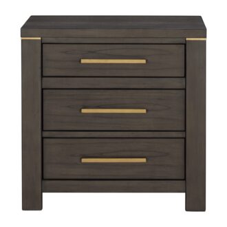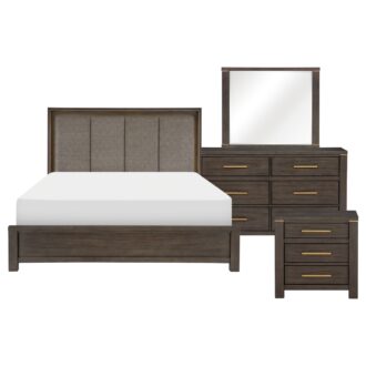 The elegant modern profile of the Scarlett Collection will be the perfect addition to your bedroom. Cashew solid wood and mindy veneer is finished in a brownish gray with gold finished hardware and accent banding lending subtle contrast to the profile of the collection. The headboard features LED backlighting, enhancing the gray fabric headboard insert.