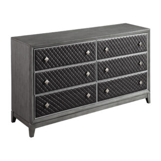 Modern styling is achieved by pairing classic design elements with eye-catching bold lines culminating in the chic look of the West End Collection. Painted silver accent subtly frames the diamond-patterned gray faux leather fronts of the dresser, each providing complementing contrast to the gray wire-brushed finish of the collection’s birch veneer. Square nickel finished hardware fronts each drawer, furthering the modern look of the West End Collection.