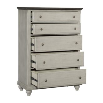 In nod to modern farmhouse design, the Mossbrook Collection features a classic profile that will be a perfect addition to your home’s décor. The pine solids and oak veneer of the collection feature a light gray finish, subtly highlighting the wood’s grain. The dark brown top of the chest provides contrast, as do the antique pewter tone knobs that front the drawers.