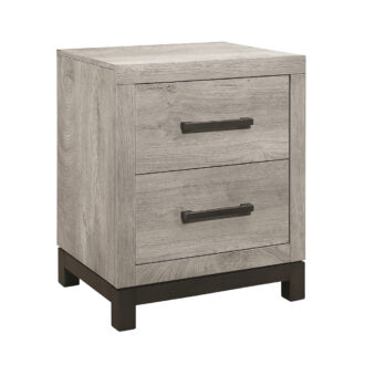 The sleek design of the Zephyr Collection pairs clean lines with modern convenience to create a style that will be the perfect palette for your design aspirations. Visually tying the nightstand together are the painted metal-finish banding of the base rail and the metal bar hardware that fronts each drawer, culminating in an accenting contrast to the gray faux wood finish of the melamine veneer.