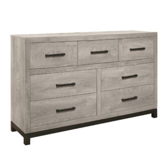 The sleek design of the Zephyr Collection pairs clean lines with modern convenience to create a style that will be the perfect palette for your design aspirations. Visually tying the dresser together are the painted metal-finish banding of the base rail and the metal bar hardware that fronts each drawer, culminating in an accenting contrast to the gray faux wood finish of the melamine veneer.