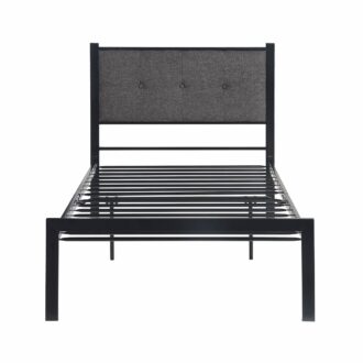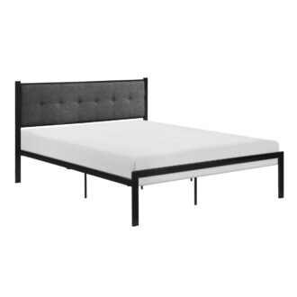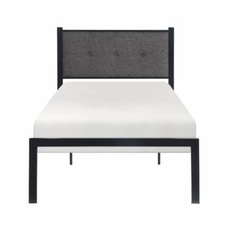 The design of the Samuel Collection pairs black metal support framing and a button-tufted headboard panel to create a versatile style perfect for your home. The gray textured fabric upholstery of the headboard panel provides classic accent to the black of the bed’s low-profile frame. The collection is offered in Queen, Full, and Twin.