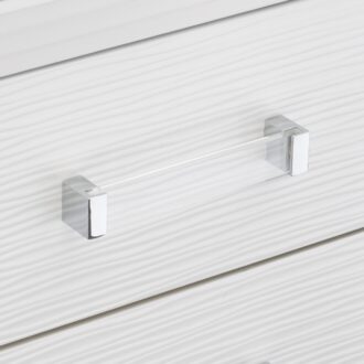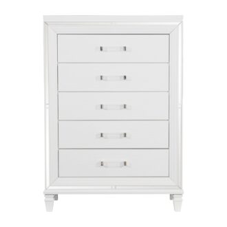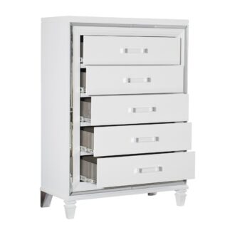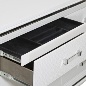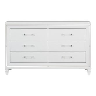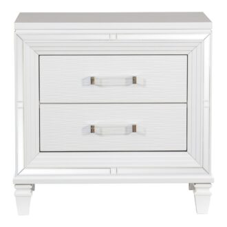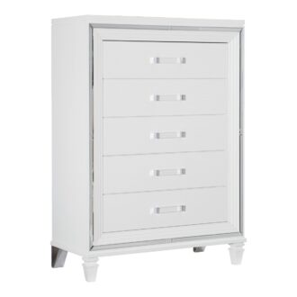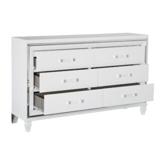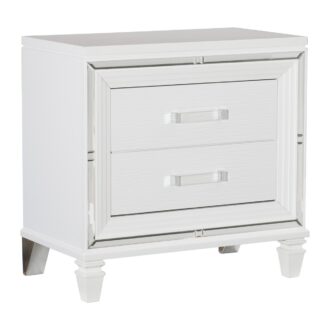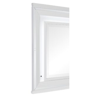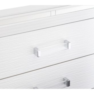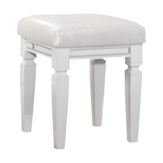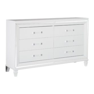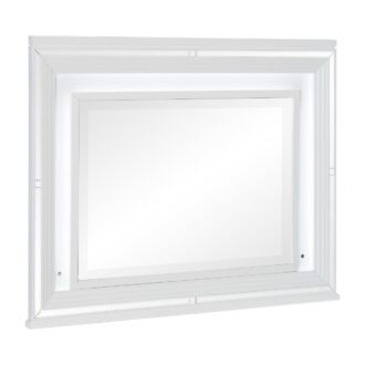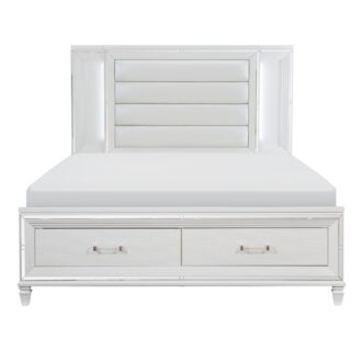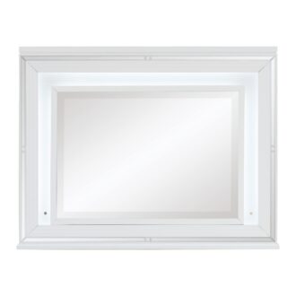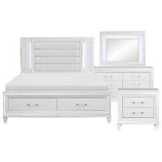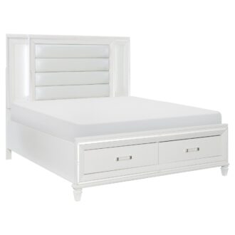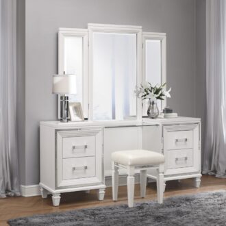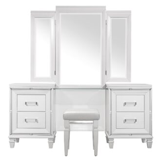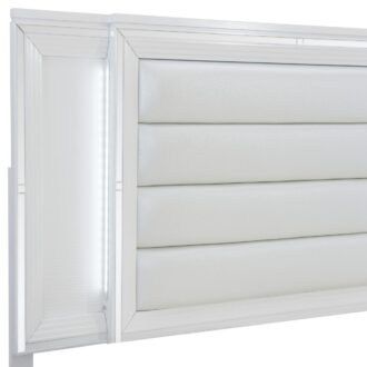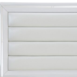 Designed to help your bedroom reach its full glamorous potential, the Tamsin Collection’s unique attributes blend to create a stylish and functional addition to your lifestyle. Mirrored framing provides dramatic enhancement to each piece in the collection, while LED back-lighting, from the vertical headboard panels and mirror, illuminates and highlights the white finish of the collection. Acrylic hardware provides unobtrusive decorative touch to the drawer fronts of the case pieces and storage footboard, with the faux leather-covered padded headboard insert lending decorative contrast to the finish of the collection. Hidden jewelry drawers in the dresser create discrete storage space for your fancy accoutrements. Also providing functional display to the collection is the available vanity. The mirrored front paired with drawer storage creates the perfect platform to prepare your glamorous self.