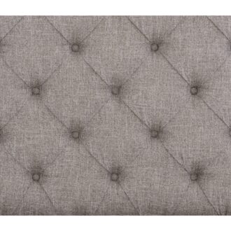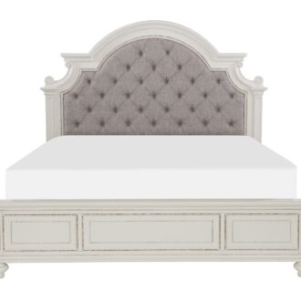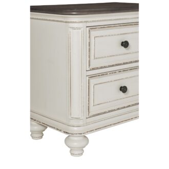 Soft, sweeping curves define the elegant profile of the Baylesford Collection. The bedroom is softened by an antique white rub-through finish with brown-gray finished framed-plank case good tops, creating a romantic aesthetic will place beautifully within your bedroom. Dark gray pleated, button-tufted fabric provides stunning contrast to the look of the bed, while dark finished metal knob hardware provides complementing contrast.