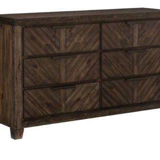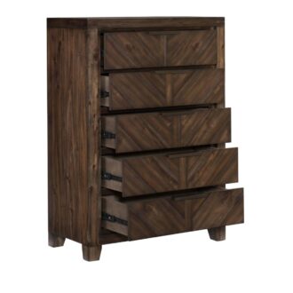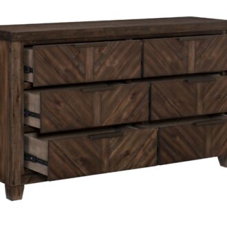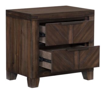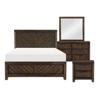 Inspired by the aesthetic of modern-rustic design, the Parnell Collection utilized bold enhancement to create the perfect addition to your bedroom. V-matched planks draw immediate attention to their visually stunning shape and the rustic cherry finish over acacia veneers that defines the