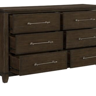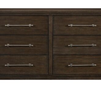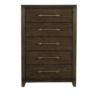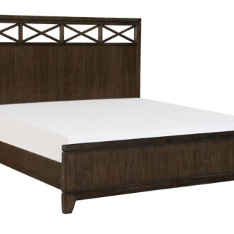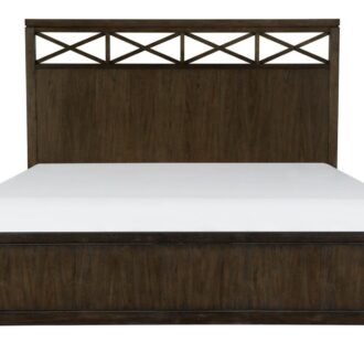 The contemporary styling of the Griggs Collection will be the perfect addition to your bedroom. The prominent ash veneer features a dark brown finish lending to the modern appearance. X-framing tops the headboard and understated lines of the panel bed. Fixed drawer pulls center each case piece further lending to the soft modern look.