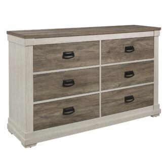 Designed for your transitionally styled bedroom is the Arcadia Collection. The two-tone look of the group is achieved with white framing and variegated gray printed faux-wood grain veneer. Dark hardware lends visual contrast to the classic shape of the dresser.