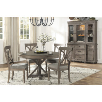 The solid transitional styling of the Cardano Collection creates an impactful design presence in your dining room. Utilizing distinct accent techniques – plank effect, rasping, saw marks – and pairing them with traditional framing and a light finish – brown wood over acacia veneers – creates a collection that is worthy of your dining room. The 54-inch round table tables allow for perfect placement within your space. An x-framed pedestal base supports the tabletop.
