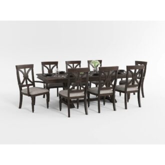 The solid transitional styling of the Cardano Collection creates an impactful design presence in your dining room. Utilizing distinct accent techniques – plank effect, rasping, saw marks – and pairing them with traditional framing and a light finish – brown wood over acacia veneers – creates a collection that is worthy of your dining room. The 96-inch rectangular table tables allow for perfect placement within your space. The tabletop expands to its full length with the addition of the dual extension leaves. An x-framed double pedestal trestle base supports the tabletop.