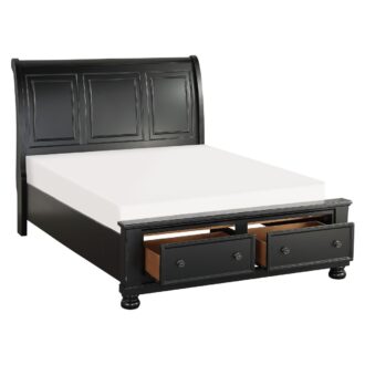 Casual transitional styling lends versatility to the placement of the Laurelin Collection in a number of bedroom settings. The queen sleigh platform bed features a black sand-through finish can transition from traditional to country casual, with accents including – antiqued bronze knob hardware on the footboard’s drawer’s framed fronts and bun feet providing support.