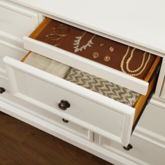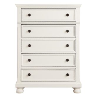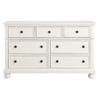 Casual transitional styling lends versatility to the placement of the Laurelin Collection in a number of bedroom settings. The white sand-through finish creates a versatile look allowing for placement of the collection in traditional to country casual environments. Antiqued bronze knob hardware punctuates the look of each framed drawer front, providing complementing contrast. Hidden drawers in the nightstand and dresser provide discrete storage for your valuables, while the storage drawers of the footboard provide a more visible means of additional storage capability. Bun feet support the case goods and a sleigh headboard finish off the transitional design of the collection.