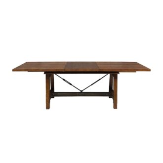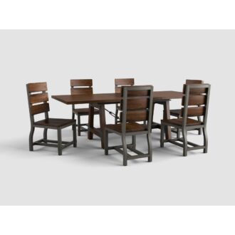 Heavily influenced by industrial design, the Holverson Collection will lend a unique look to your personal space. Gunmetal finished wood framing provides sturdy structure and profile to each piece in this collection. Faux rivets provide additional detail to the metal bracketing that is prominently on display. Rectangular dining height table allows for perfect placement within your casual dining space. Side chair for both table heights present the opportunity to customize seating to fit your lifestyle. A rustic brown milk crate finish is utilized to highlight the acacia veneer. The open display hutch paired with the drop front server base, provides ample display and behind door storage for your tabletop accessories.