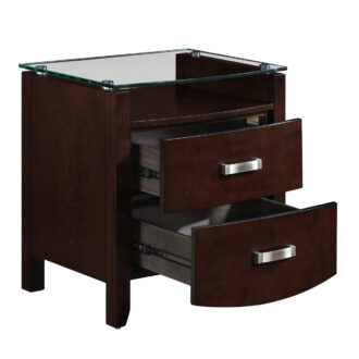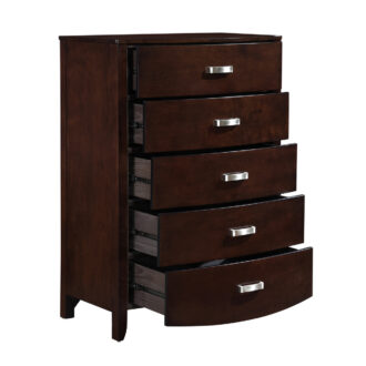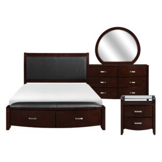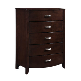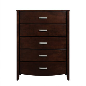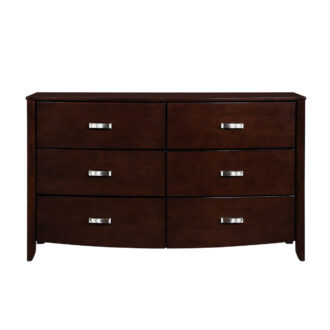 Taking the expected design elements of hard contemporary and putting a decidedly feminine curve into the mix make the Lyric Collection a unique addition to your new bedroom design. With each curve comes a new twist – satin nickel hardware accents the dark espresso finish, bowfront case pieces feature ball bearing drawer glides, and compliment the padded sleigh headboard and footboard, while a round, contemporary mirror reflects the modern designs that you have selected. A final unique addition to the collection is the glass-topped night stand that furthers the contemporary feel.