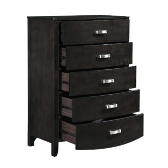 Taking the expected design elements of hard contemporary and putting a decidedly feminine curve into the mix make the Lyric Collection a unique addition to your new bedroom design. With each curve comes a new twist – satin nickel hardware accents the brownish gray finish and bowfront case pieces feature ball bearing drawer glides.