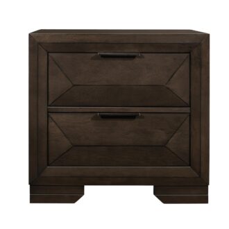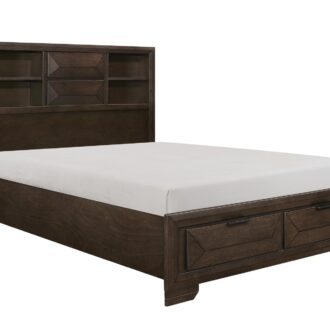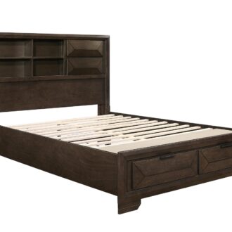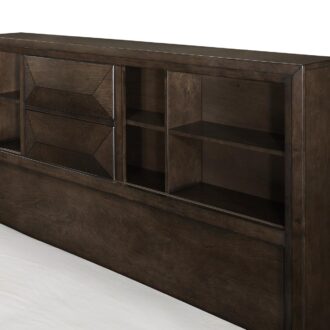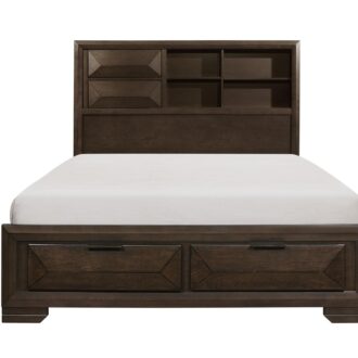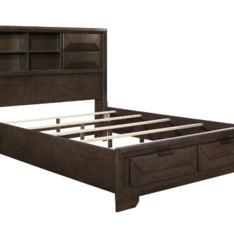 Contemporary design and convenient functionality intersect in the design of the Chesky Collection. Birch veneer is finished in a warm espresso in this unique bedroom offering. Raised panels provide visual interest to the drawer fronts, headboard and footboard. The bookcase headboard provides ample storage and display space as does the storage drawer footboard. Complementing horizontal metal hardware lend additional accent to the case pieces.