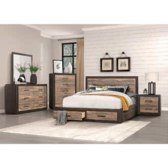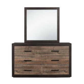 The Miter Collection combines the clean lines of contemporary styling with the look of natural wood grain in this stylish dresser. The dresser’s embossed faux-wood veneer is utilized in both mahogany and ebony to achieve a 2-tone contrasted finish. Antique brass tone hardware provides additional contrast to the printed wood grain.