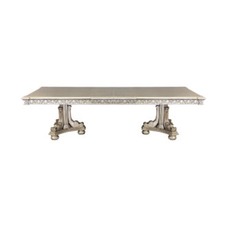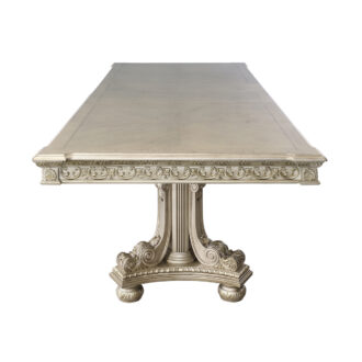 Old-World European styling is captured in the dramatically elegant Catalonia Collection. Traditional design elements reign at every turn – egg and dart molding, acanthus leaf carving, bead molding, gold tipping and extravagant carvings – creating a sophisticated look for your dining room. A traditional platinum gold finish is utilized to highlight the oak veneer and subtle decorative inlay pattern found on the dining table’s top.