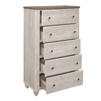 Transitional-rustic styling is expertly achieved in the design of the Nashville Collection. The two-tone faux wood look of melamine provides distinct contrast with antique white and brown lending visual texture to the chest. The classic framing of the collection is paired with knob hardware that features white wood and black metal, to complete the rustic look.