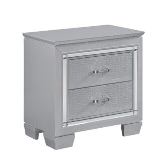 Glamour reigns in the design of the Allura Collection. Framing nightstand is a decorative beveled mirror accent that enhances the illumination from the touch-engaged LED under-light of the nightstand. The alligator embossing of the drawer fronts is paired with high-polished crystal-enhanced hardware that boldly decorates the silver finish.