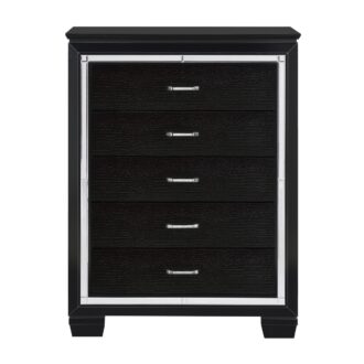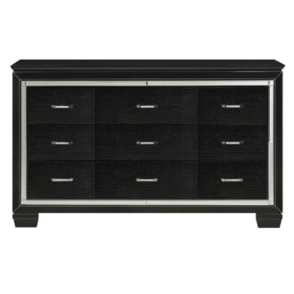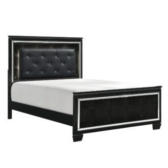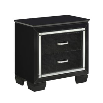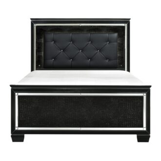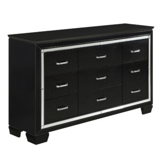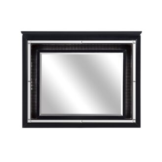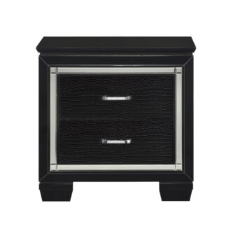 Glamour reigns in the design of the Allura Collection. Framing each piece is a decorative beveled mirror accent that enhances the illumination from the touch-engaged LED backlight of the headboard and mirror, as well as the under-light of the night stand. Alligator embossing and high polished crystal-enhanced hardware boldly accent the black finish as does the black faux leather crystal-tufted headboard insert of the collection.